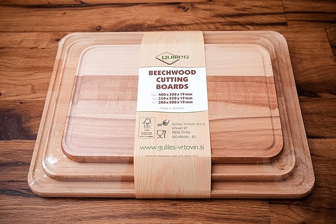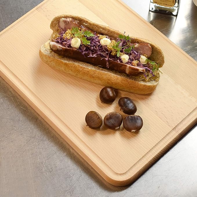 Schneidebretter haben eine abgerundete Kante für besseren Halt und eine kleinere Rille zum Auffangen von Flüssigkeiten. Sie sind für den Einsatz durch Profiköche oder Hobbyköche konzipiert. Reinigen Sie sie per Hand (geben Sie Küchengeschirr aus Holz niemals in die Spülmaschine).