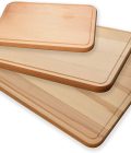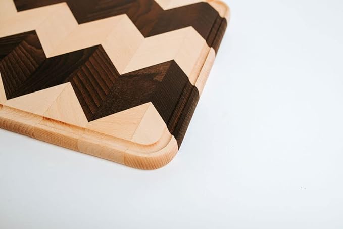 Cutting board have a rounded edge for easier grip and a smaller groove to catch liquids. It is designed for use by professional chefs or home cooking enthusiasts.